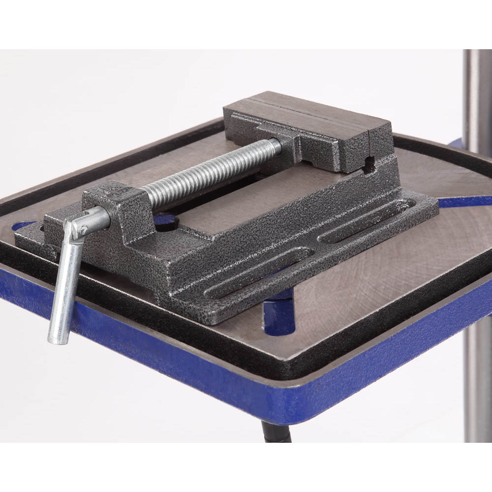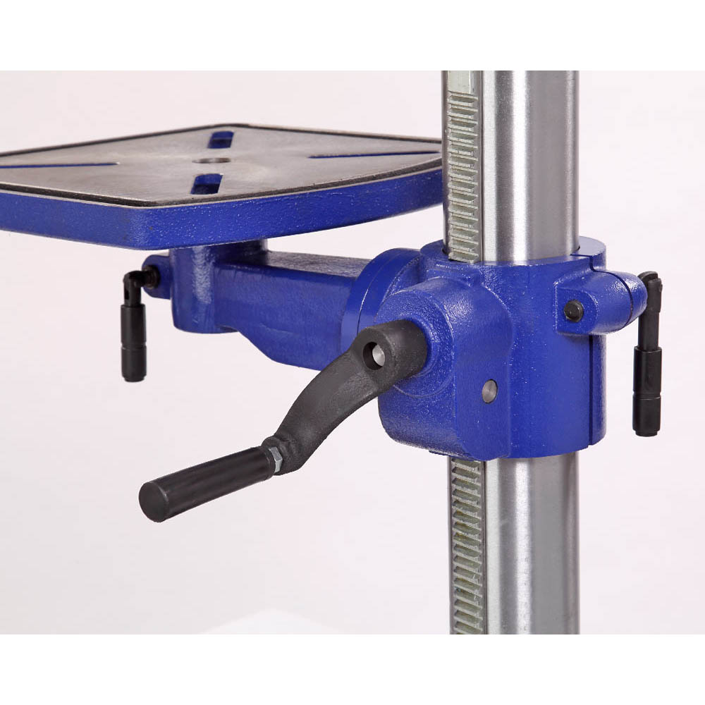 Патрон быстрозажимной с максимальным диаметром зажимаемого хвостовика инструмента 16 мм. Диаметр стойки (колонны) 73 мм, имеется зубчатая рейка, поднятие/опускание стола настраивается с помощью рукоятки. Управление станком осуществляется тремя кнопками – «пуск», «остановка», кнопка выключения лазера - указателя. В опоре имеется четыре отверстия для крепления к верстаку, что дает дополнительную устойчивость и безопасность.