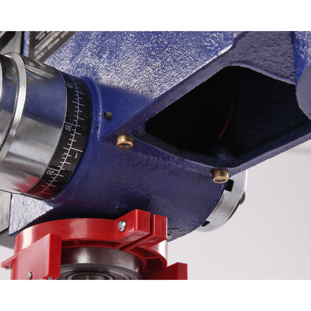 Заготовку можно крепить как к рабочему столу, так и к основанию, все зависит от ее размера. для точного позиционирования точки сверления, станок оснащен лазером - указателем. В комплекте предусмотрены тиски. Для их крепления есть четыре паза на рабочем столе и два на основании. Шкала, расположенная на рукоятке регулировки глубины сверления, показывает ход пиноли шпинделя, с ее помощью можно настраивать ход пиноли, для этого необходимо провернуть шкалу, стрелка на корпусе будет показывать значение, на которое будет возможно погружение сверла, затем затянуть барашек. Наконечники тройной рукояти удобной формы, что способствует плавной подаче сверла к заготовке.