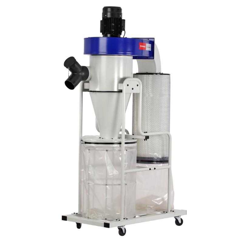 Вытяжная установка BELMASH CTDC-1.2 предназначена для удаления древесных опилок, стружки и пыли, образующихся в процессе деревообработки. Рассчитана на подключение к сети 230 В. Мощность 2200 Вт. Сначала воздух с большой скоростью тангенциально подается внутрь цилиндрической части корпуса циклона. Под воздействием центробежной силы крупные частицы отбрасываются к стенкам, а затем вниз – в коническую часть аппарата. Оттуда отходы попадают в большой стружкосборник. Это первая ступень очистки. Затем воздух поступает в фильтр-картридж, где за счет прохождения потока через фильтрующий элемент с большой площадью поверхности (3,5 кв. м) происходит окончательная очистка. Мелкие частицы собираются в малом мешке, который крепится под фильтром. Это вторая ступень очистки. Очистка фильтра проходит ручным способом, при вращении рукоятки осевшие частицы стряхиваются вниз.