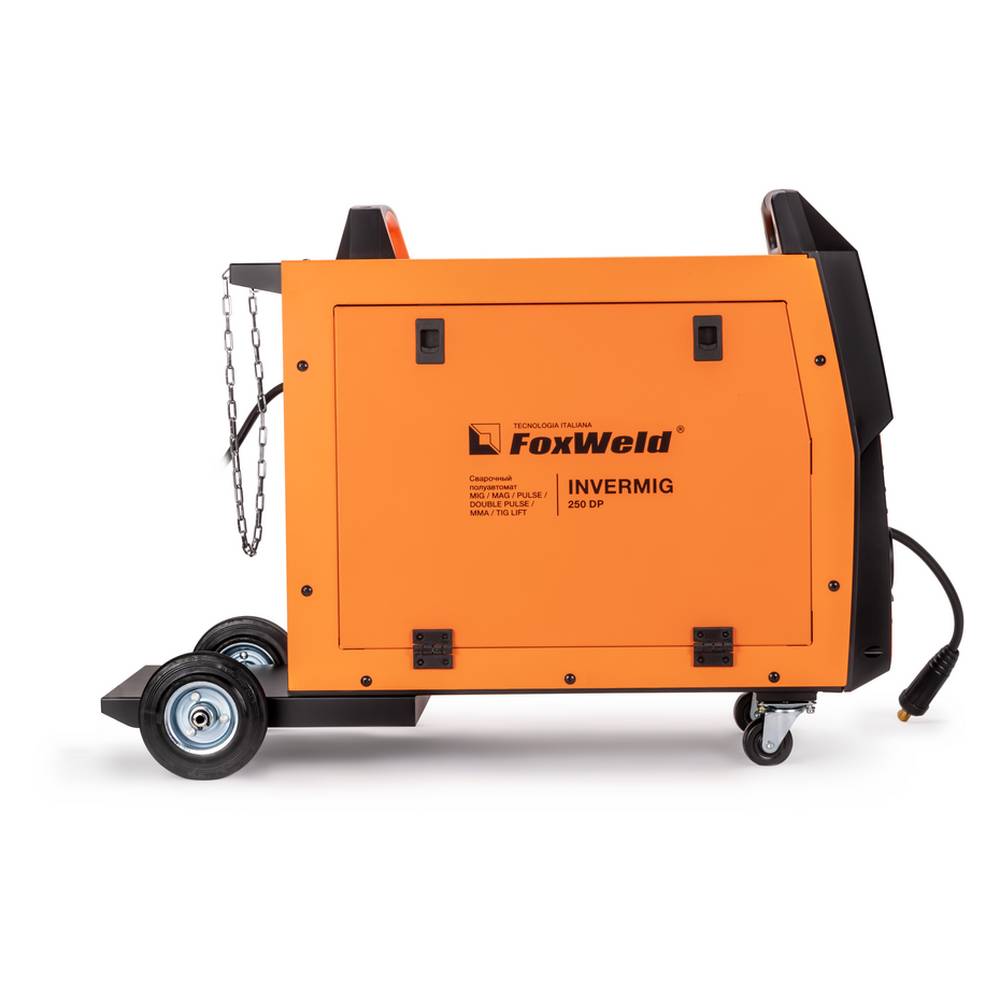 Сварочный инверторный полуавтомат FOXWELD INVERMIG 250 DP с синергетическим управлением предназначен для сварки проволокой MIG/MAG в импульсном и обычном режимах, а также может работать в режимах аргонодуговой сварки TIG и ручной сварки ММА. INVERMIG 250 DP — это многофункциональный сварочный аппарат с двойным импульсом, высокой продолжительностью нагрузки, в нём предусмотрены выбор и сохранение программ и различные режимы управления горелкой. Информативный жидкокристаллический дисплей, 4-роликовый механизм подачи проволоки, интеллектуальная система вентиляции, 2 мощные ручки на корпусе, платформа с колёсами для перемещения и место для баллона с газом – в конструкции аппарата есть всё необходимое для работы в сфере производства металлоконструкций.