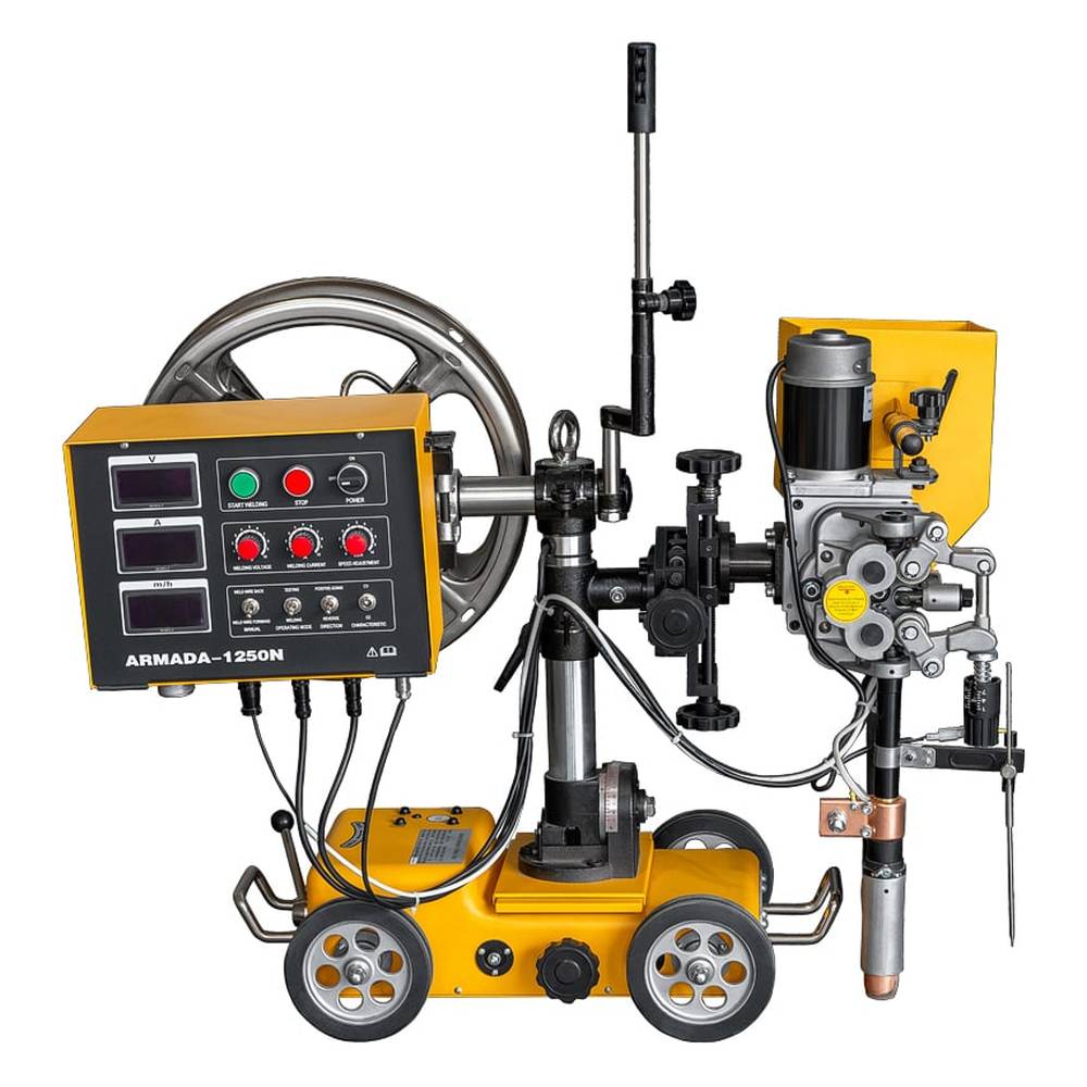 Промышленный многофункциональный сварочный аппарат для автоматической сварки под флюсом (SAW) с функцией ручной дуговой сварки покрытым электродом (ММА) и воздушно-дуговой строжки (Googing). Источник сварочного тока в составе аппарата обеспечивает сварочные процессы с жесткой ВАХ «CV» (Constant Voltage) и падающей ВАХ «СС» (Constant Current) при 100% ПВ с током сварки до 1 250 А. Возможно выполнение сварных изделий из всех видов стали с толщинами от 3 до 350 мм.