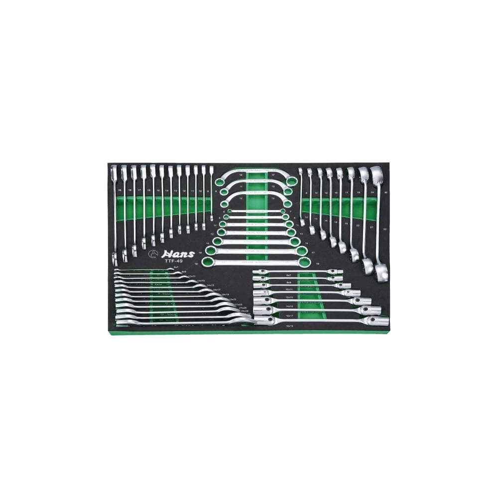 Набор комбинированных ключей HANS 49 предметов TTF-49 TTF-49 используется для работ с крепежом при ремонтных и монтажных работах. Инструмент выполнен из высококачественной стали, что обеспечивает прочность, стойкость и долгий срок службы. Ложемент изготовлен из экологичного безопасного пеноматериала и позволяет рационально хранить и транспортировать инструмент. Размер ложемента 570х410х45 мм.