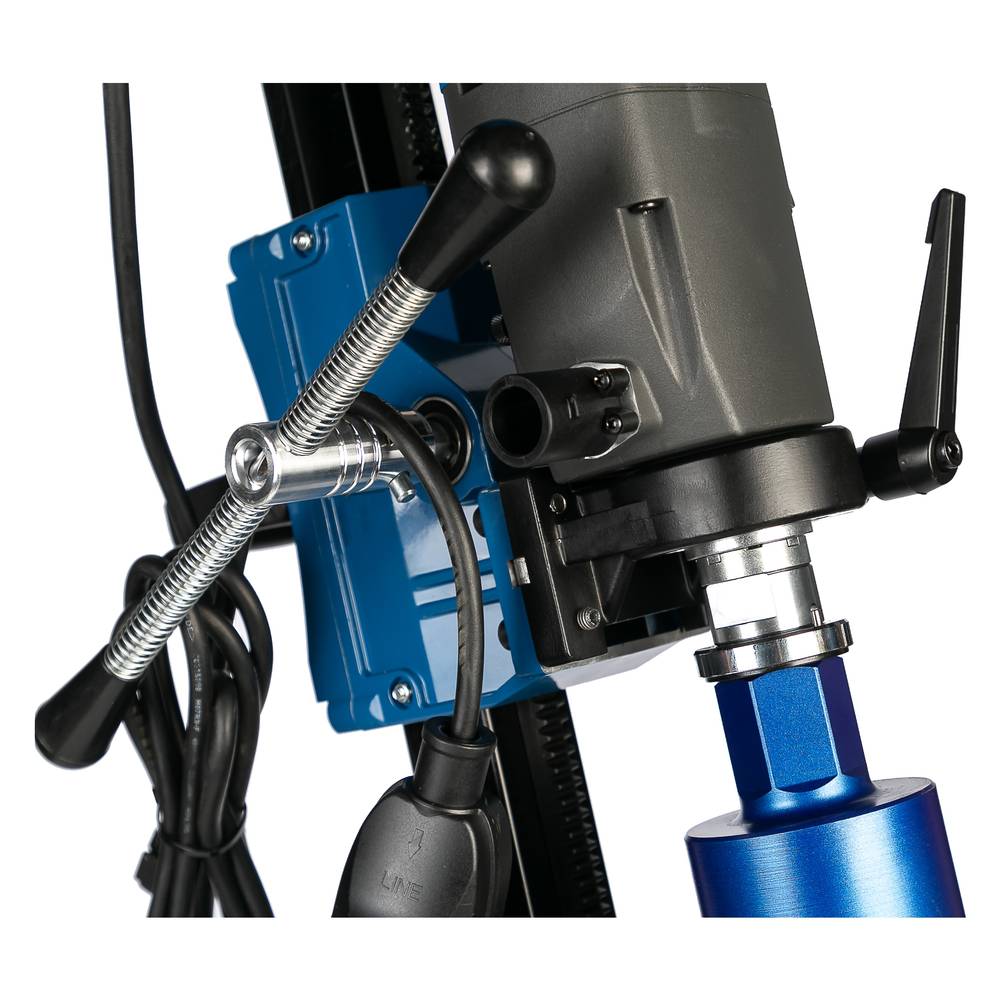 Двигатель алмазного бурения KEOS PULSAR KS-180 мощностью 1,9 кВт с функцией микроудара может эксплуатироваться как в ручную, так и с установкой на штатив. Мотор оборудован быстросъемной муфтой для подключения пылесоса, а так же водяной муфтой для сверления с подачей воды. Редуктор двигателя оснащен предохранительной муфтой.