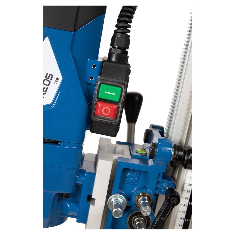 Штатив обладает быстрой и лёгкой сменой угла наклона, что даёт вам гибкость в работе. Ролики на каретке обеспечивают точное и плавное перемещение двигателя для аккуратного бурения. Мотор крепится к штативу с помощью быстросъёмной пластины, что упрощает сборку и разборку.