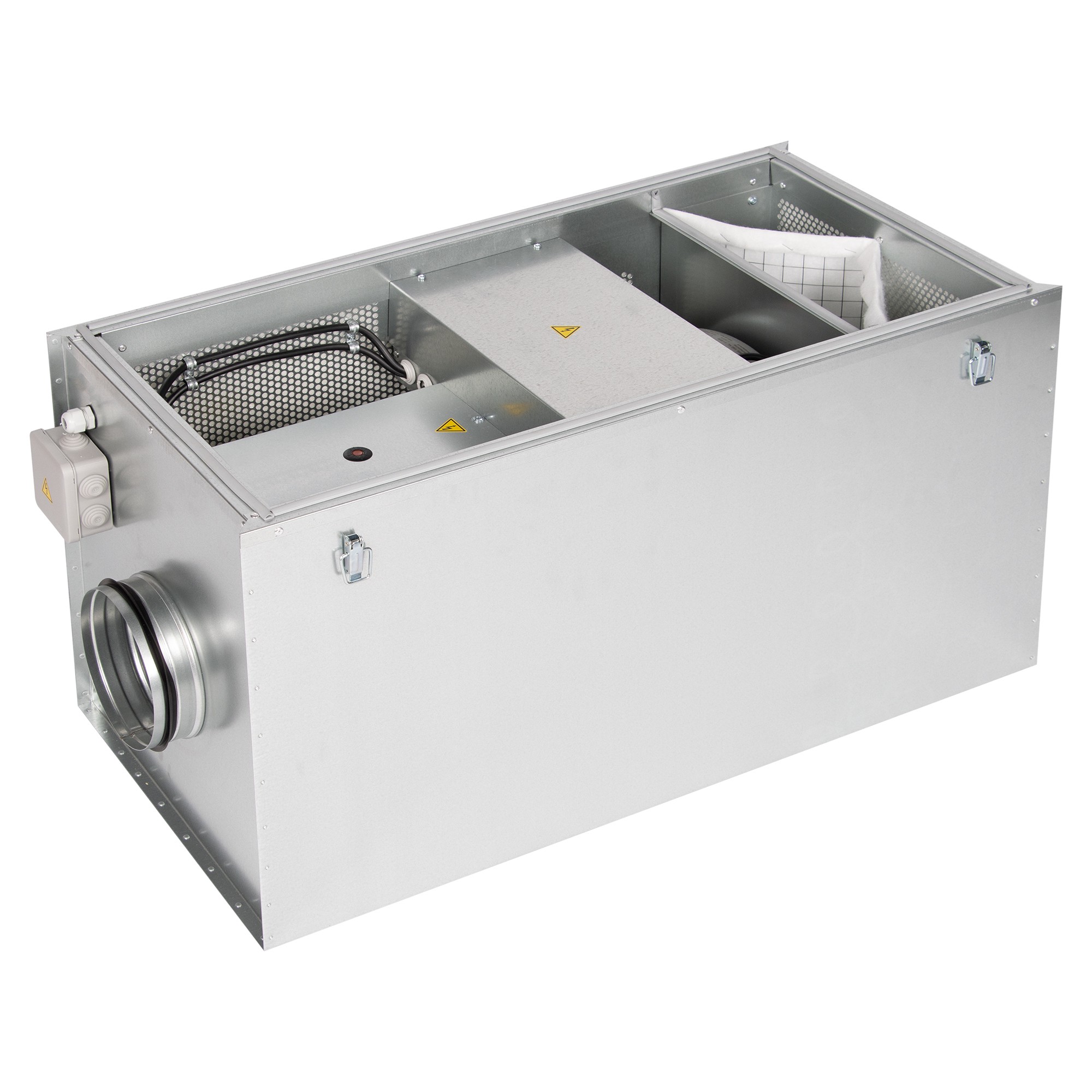 Приточная установка оснащена фильтром класса EU5, электрическим нагревателем с ТЭНами из нержавеющей стали и вентилятором. Вентилятор оборудован асинхронным двигателем с внешним ротором и не требующими обслуживания уплотненными подшипниками с увеличенным сроком службы. Защита двигателя вентилятора осуществляется встроенными термоконтактами. Трехфазные электрические нагреватели оснащены двухступенчатой защитой от перегрева. Первая ступень настроена на 50°С и перезапускается автоматически, вторая ступень настроена на 100°С и перезапускается вручную.