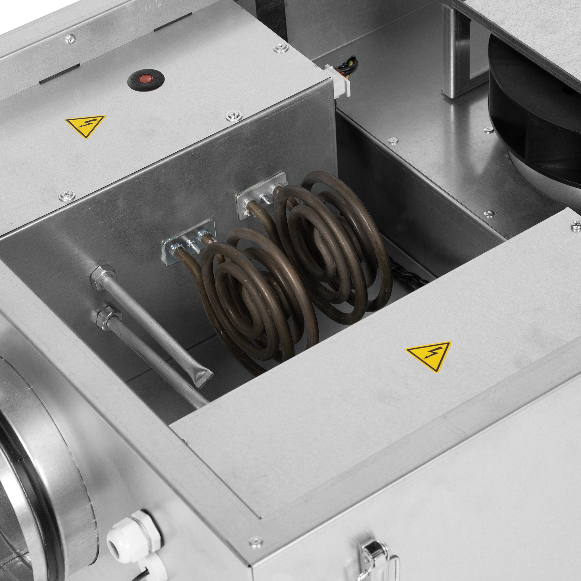 Приточная установка SHUFT серии ECO-SLIM выпускается в двух модификациях: или с водным нагреваем (модель 1100) или с электрическим нагревателем. В обеих модификациях воздушный клапан размещен снаружи корпуса, что улучшает его ремонтопригодность и позволяет выносить клапан с приводом к месту забора наружного воздуха. Установка обладает компактными габаритами и низким уровнем шума, что значительно упрощает выбор его размещения в квартире.