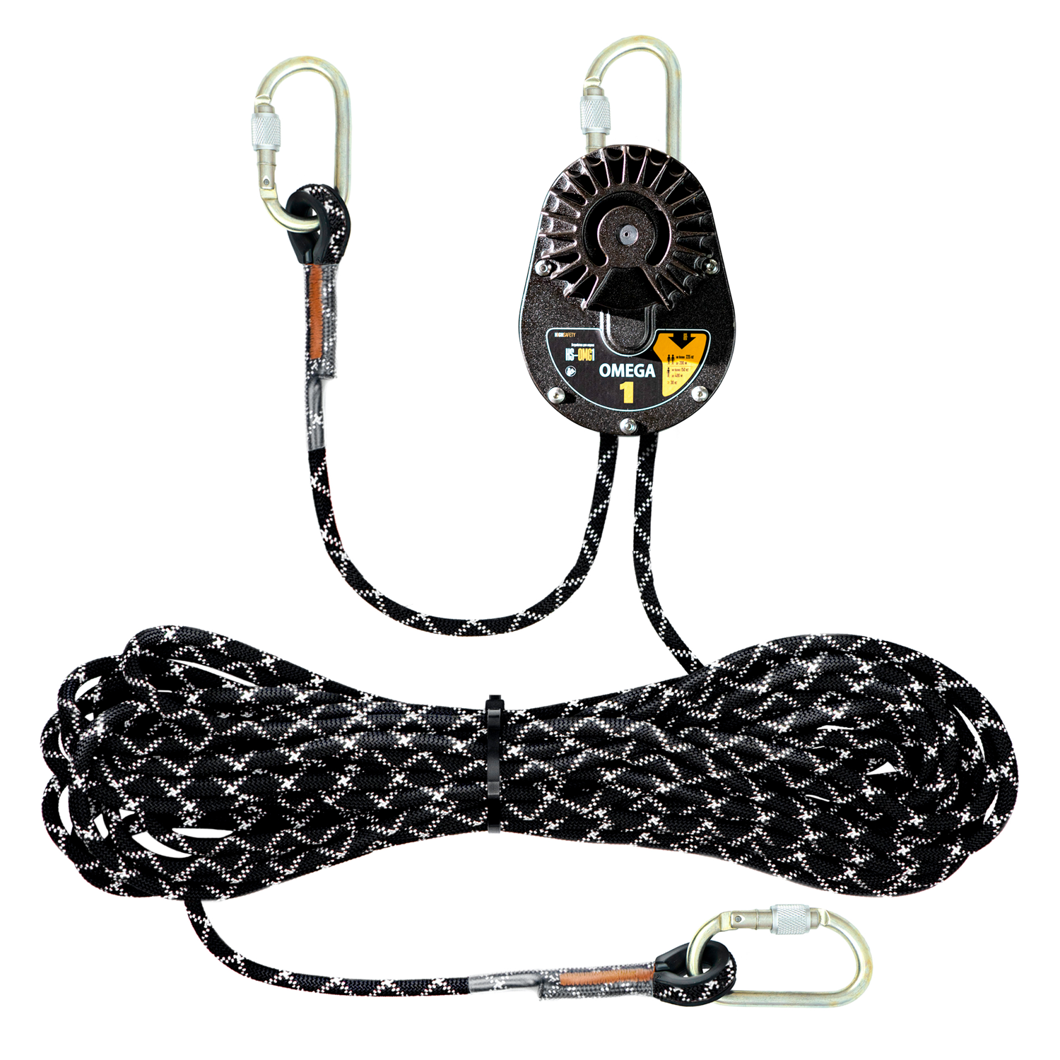 Устройство для спуска OMEGA 1 является элементом системы обеспечения безопасности работ на высоте. Представляет собой устройство спуска класса А для защиты от падения, с помощью которого человек может спускаться на ограниченной скорости самостоятельно или при помощи другого человека с более высокого места на более низкое так, чтобы предотвратить его свободное падение (например, работа на кранах, мачтах и других местах, где может потребоваться эвакуация). Устройство для спуска оснащено ручным механизмом фиксации троса, исключающим свободное падение. Конструкция устройства позволяет осуществлять несколько повторных спусков при необходимости эвакуации нескольких человек подряд. Трос: полиамидный канат, диаметр 10 мм. Концы троса на концах усилены пластиковыми коушами (ПНД), прошиты контрастными нитками сигнального цвета и защищены термоусадочной трубкой из ПВХ. В комплектацию OMEGA 1 входят следующие элементы: три карабина (овальный, стальной, раскрытие 18 мм), две петли AP007 (длина 0,6 м и 1,5 м), транспортировочная сумка/баул.