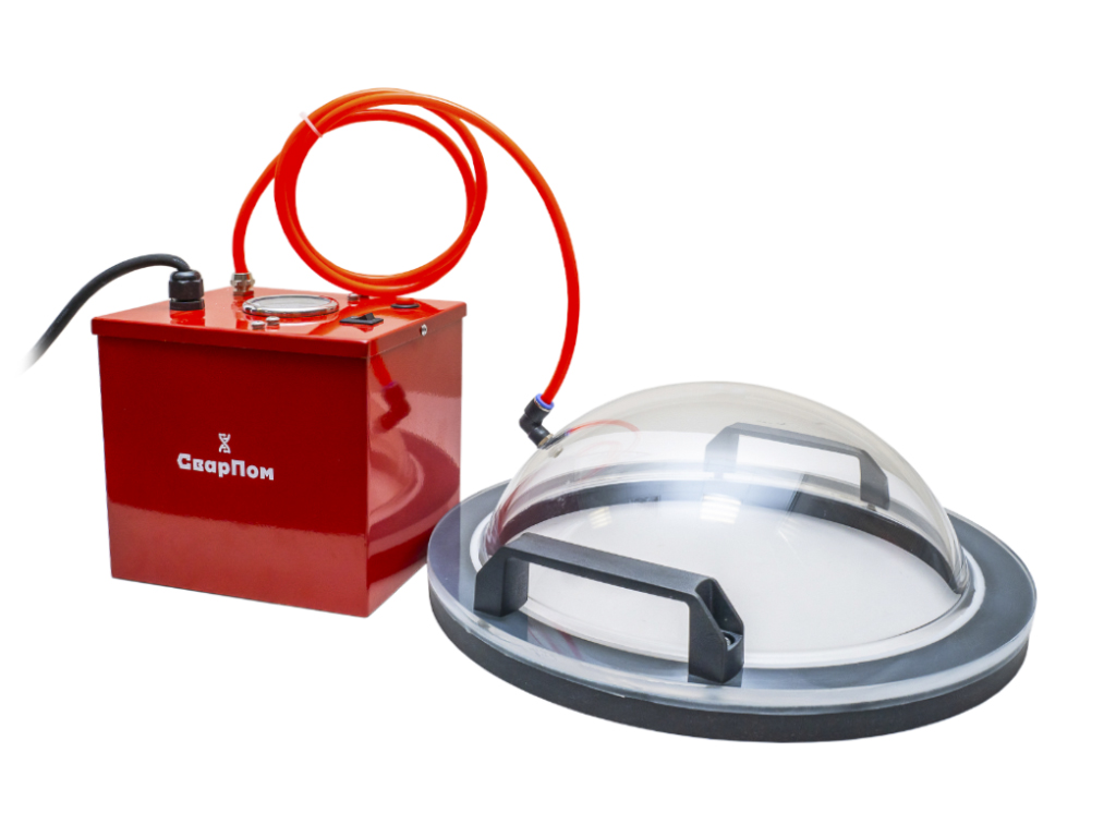 Вакуумное проверочное устройство СП62 используется для контроля качества сварных швов полимерных мембран на строительных площадках (проверка на герметичность). Простота использования и высокая достоверность результатов испытаний. Большая площадь контролируемой поверхности (700 кв. см.) Высокая скорость откачки воздуха (30 л/мин). Устройство представляет собой прозрачную полусферу с мягким обтюратором на торце и вакуумных насос. Давление контролируется по манометру.