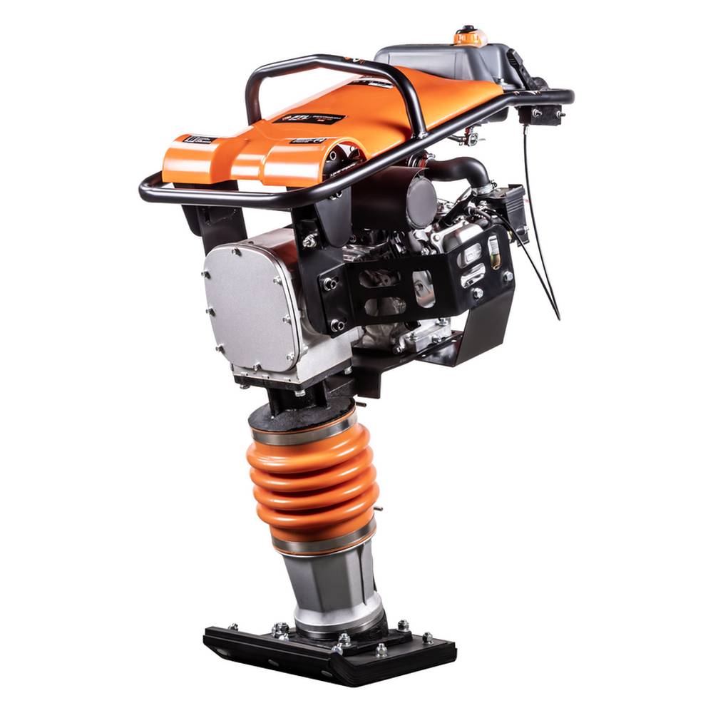 Вкупе с цельносварной опорной плитой вибротрамбовка достигает рабочего веса около 75 кг и позволяет добиваться уплотнения рабочей поверхности до 350 мм.