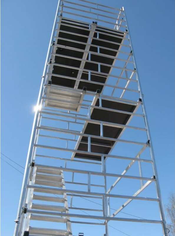 Вышка модульная алюминиевая MEGAL ВМА 1400Л/11 предназначена для организации рабочего места на высоте в строительно-монтажных, ремонтных и прочих работах. Сборка вышки производится без использования инструментов за счет наличия замкового крепления элементов. Вышка собирается из двухметровых и метровых вертикальных рам. Рамы стыкуются между собой и фиксируются крепежными скобами. Площадки соединяются наклонными лестничными маршами с рифлеными широкими ступенями, что обеспечивает комфортный подъем. Каждый марш оснащен перилами-ограждениями для безопасности. Монтируется на компактном основании из стальных стяжек. Рабочая площадка размером 2,0 х 1,4 м позволяет с удобством расположиться четырем рабочим с инструментом. Высокая грузоподъемность обеспечивается за счет использования труб и профилей со стенкой не менее 2,5мм. Вышка имеет легкий вес за счет использования алюминиевых сплавов. Наличие поворотных колес со стопорами обеспечивает мобильность вышки.