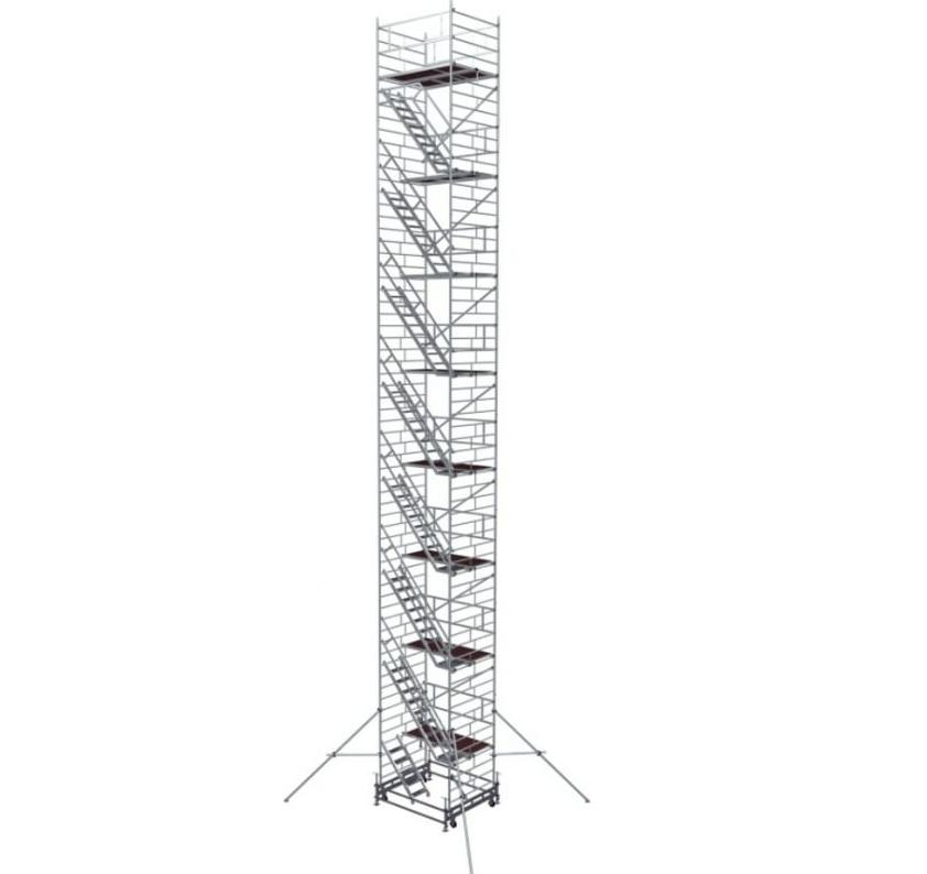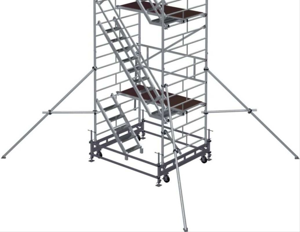Вышка модульная алюминиевая MEGAL ВМА 1400Л/17 предназначена для организации рабочего места на высоте в строительно-монтажных, ремонтных и прочих работах. Сборка вышки производится без использования инструментов за счет наличия замкового крепления элементов. Вышка собирается из двухметровых и метровых вертикальных рам. Рамы стыкуются между собой и фиксируются крепежными скобами. Площадки соединяются наклонными лестничными маршами с рифлеными широкими ступенями, что обеспечивает комфортный подъем. Каждый марш оснащен перилами-ограждениями для безопасности. Монтируется на усиленном основании из двойной траверсы. Рабочая площадка размером 2,0 х 1,4 м позволяет с удобством расположиться четырем рабочим с инструментом. Высокая грузоподъемность обеспечивается за счет использования труб и профилей со стенкой не менее 2,5мм. Вышка имеет легкий вес за счет использования алюминиевых сплавов. Компенсация неровной поверхности возможна за счет регулирования вышки по высоте с помощью винтовых опор. Наличие поворотных колес со стопорами обеспечивает мобильность вышки.