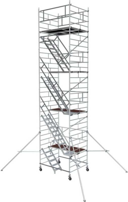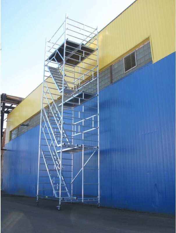 Вышка модульная алюминиевая MEGAL ВМА 1400Л/9 предназначена для организации рабочего места на высоте в строительно-монтажных, ремонтных и прочих работах. Сборка вышки производится без использования инструментов за счет наличия замкового крепления элементов. Вышка собирается из двухметровых и метровых вертикальных рам. Рамы стыкуются между собой и фиксируются крепежными скобами. Площадки соединяются наклонными лестничными маршами с рифлеными широкими ступенями, что обеспечивает комфортный подъем. Каждый марш оснащен перилами-ограждениями для безопасности. Монтируется на компактном основании из стальных стяжек. Рабочая площадка размером 2,0 х 1,4 м позволяет с удобством расположиться четырем рабочим с инструментом. Высокая грузоподъемность обеспечивается за счет использования труб и профилей со стенкой не менее 2,5мм. Вышка имеет легкий вес за счет использования алюминиевых сплавов. Компенсация неровной поверхности возможна за счет регулирования вышки по высоте с помощью винтовых опор. Наличие поворотных колес со стопорами обеспечивает мобильность вышки.