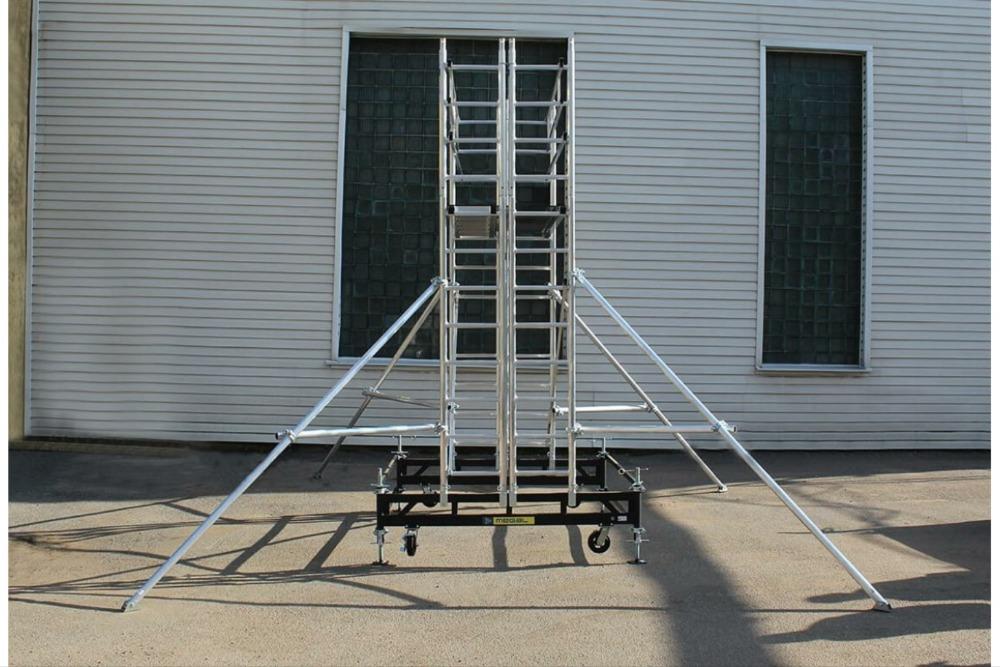 Вышка модульная алюминиевая MEGAL ВМА 900/11 используется при выполнении работ внутри резервуаров и емкостей. Габариты всех деталей не превышают 450мм, что позволяет пропустить их через технический лаз и провести сборку внутри резервуара. Вышка собирается из узких двухметровых и метровых вертикальных рам. Рамы фиксируются крепежными скобами и крепежом для стыкования рам. Безопасный подъем обеспечивается за счет использования нескользящих рифленых перекладин в рамах. Используются диагональные и горизонтальные связи (стяжки). Сборка производится без инструментов за счет наличия замкового крепления элементов. Верхний рабочий настил размером 2,0 х 0,9м с люком (составной). Промежуточные настилы размером 2,0 х 0,45м. Монтируется на усиленном основании из двойной траверсы с поворотными колесами, со стопорами. Используется надежная фиксация к стенкам резервуара за счет магнитных крепежей, которые не портят поверхность. Вышка имеет легкий вес за счет использования алюминиевых сплавов. Высокая грузоподъемность обеспечивается за счет использования труб и профилей со стенкой не менее 2,5мм. Компенсация неровной поверхности возможна за счет регулирования вышки по высоте с помощью винтовых домкратов.