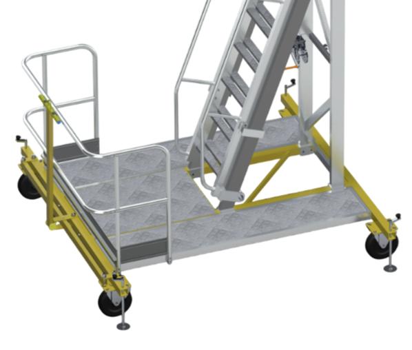 Вышка-стремянка алюминиевая для нефтяной промышленности MEGAL ВСА-4.2Н2 (2,8-4,2) -1 предназначена для обслуживания автомобильных или железнодорожных цистерн на разных высотах. Лестничный марш вышки разбит на две секции, которые могут перемещаться относительно друг друга посредством роликового узла и ручной лебедки. Высота рабочей площадки регулируется в диапазоне от 2.8 до 4.2 метров с шагом 280мм. Перила установлены по всей длине лестничного марша. Верхняя рабочая площадка прямоугольной формы, размер 1500х500 мм. Торцевая сторона площадки закрыта алюминиевым ограждением. Боковые стороны площадки закрыты цепочками. Широкое основание позволяет размещаться на нижней площадке рабочим с инструментом. Траверсы оборудованы винтовыми опорами и колёсами. Допустимая скорость перемещения 5 км/час при буксировке автомобильным транспортом.