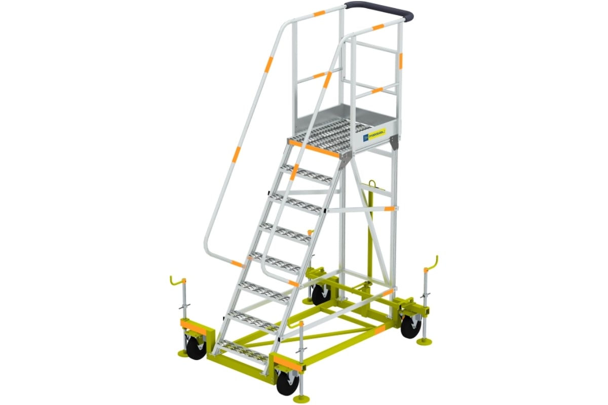 Вышка-стремянка алюминиевая MEGAL ВСА-2,5А предназначена для безопасной и удобной работы на складах, стройплощадках, в производственных цехах. За счет использования труб и профилей со стенкой не менее 2,5мм обеспечивается высокая грузоподъемность. Подъем осуществляется по широким ступеням из просечно-вытяжного листа, обеспечивающим надежное сцепление в холодное время года. Глубина ступеней 135 мм. Для безопасного подъема и спуска в конструкции предусмотрены перила по всей длине лестничного марша. Поворотные колеса обеспечивают высокую маневренность. Колесная база оснащена винтовыми опорами, обеспечивающими устойчивость изделия при работе на высоте.