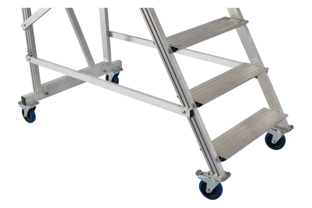 Вышка - стремянка разборная на колесах (150 кг) MEGAL ВС-1.0 предназначена для работ в торговых залах, на складах, вдоль стеллажей и других объектов, при проведении ремонтных, монтажных и иных работ на возвышении. Лестница имеет легкий вес за счет использования алюминиевых сплавов. Трехстороннее ограждение площадки со встроенной защитной планкой в районе колен, бортовое ограждение, перила по всей длине лестничного марша, ступени глубиной 160мм обеспечивают безопасный подъем, спуск и проведение работ. Площадка размером 800х680мм позволяет удобно расположиться рабочему с необходимым инструментом. Небольшая занимаемая площадь и прочные поворотные колеса со стопорами позволяют легко маневрировать в ограниченном пространстве. Легкий монтаж без специального инструмента сокращают время подготовки оборудования к работе.