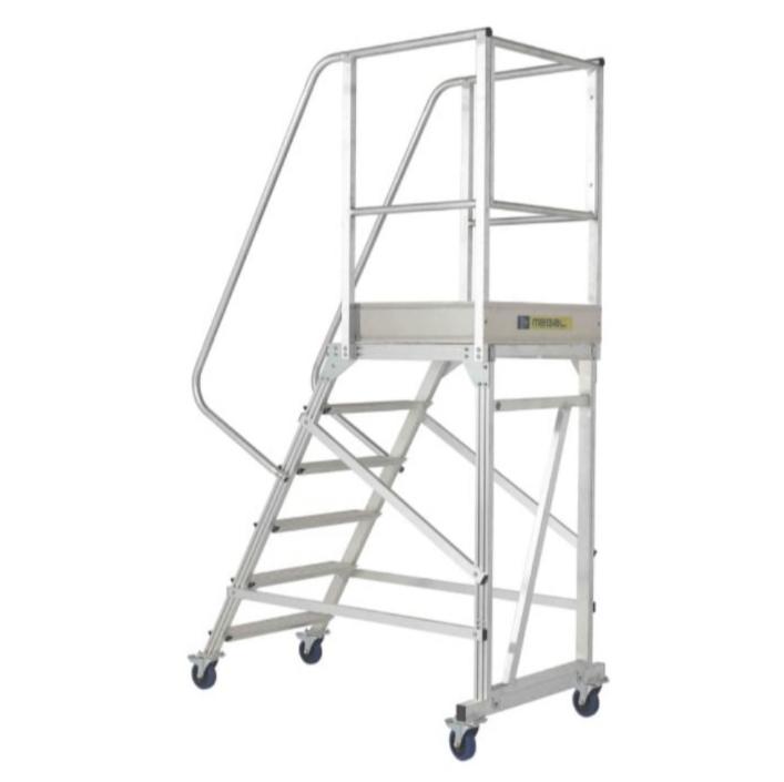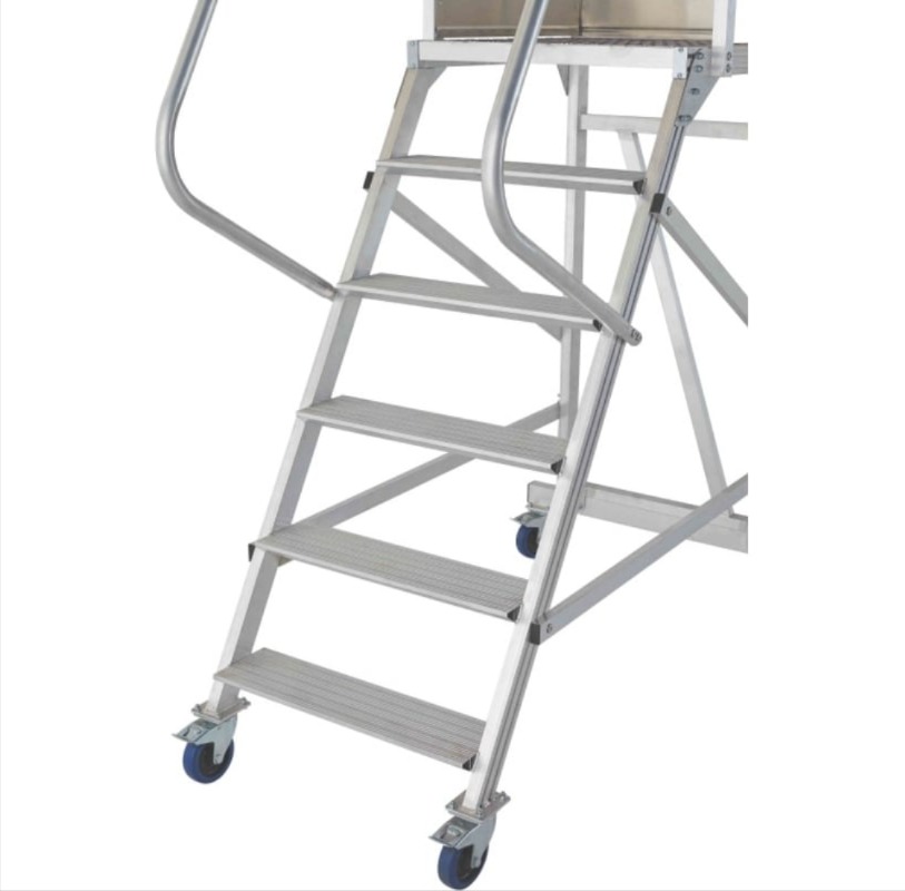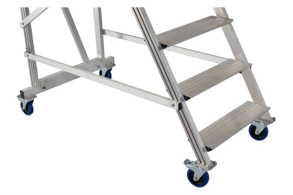 Трехстороннее ограждение площадки со встроенной защитной планкой в районе колен, бортовое ограждение, перила по всей длине лестничного марша, ступени глубиной 160мм обеспечивают безопасный подъем, спуск и проведение работ. Площадка размером 800х680мм позволяет удобно расположиться рабочему с необходимым инструментом. Небольшая занимаемая площадь и прочные поворотные колеса со стопорами позволяют легко маневрировать в ограниченном пространстве. Легкий монтаж без специального инструмента сокращают время подготовки оборудования к работе.