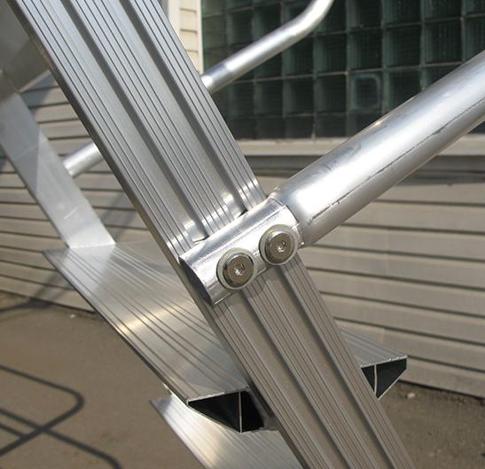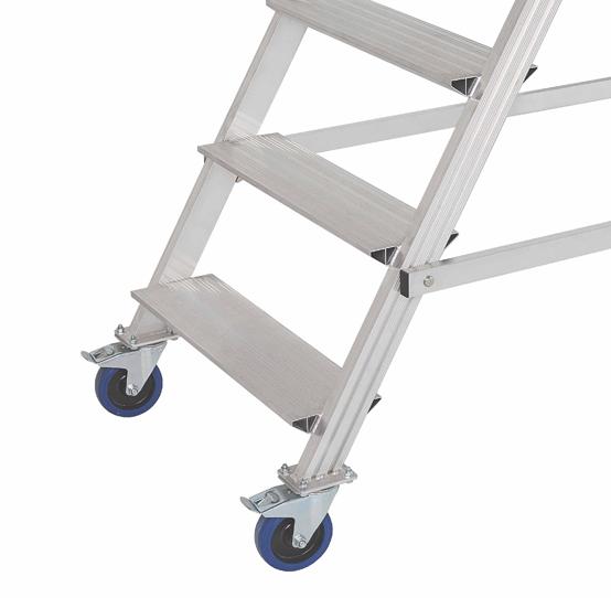 Вышка - стремянка разборная на колесах (150кг+150кг) MEGAL ВС2-4.5 предназначена для работ в торговых залах, на складах, вдоль стеллажей и других объектов, при проведении ремонтных, монтажных и иных работ на высоте. Представляет собой безопасную и легкую конструкцию из алюминиевых профилей высокой прочности. Имеет безопасные противоскользящие ступени из специального рифленого профиля. Площадка размером 800х680мм позволяет удобно расположиться рабочему с необходимым инструментом. Трехстороннее ограждение площадки со встроенной защитной планкой в районе колен, бортовое ограждение, перила по всей длине лестничного марша, ступени глубиной 160мм обеспечивают безопасный подъем, спуск и проведение работ, что подтверждает полное соответствие требованиям по ГОСТ. Все соединительные узлы и элементы полностью безопасны, обработаны и одобрены службой контроля качества. Простая и быстрая сборка лестницы без специального инструмента и поставка в виде предварительно собранных узлов сокращают время подготовки оборудования MEGAL к работе. Максимальный срок службы достигнут благодаря коррозионностойким свойствам алюминиевых сплавов. Небольшая занимаемая площадь и прочные поворотные колеса со стопорами позволяют легко маневрировать в ограниченном пространстве.