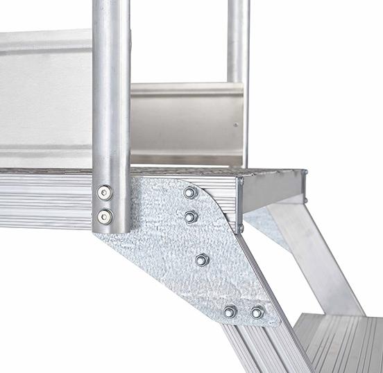 Вышка - стремянка разборная на колесах (300кг+150кг) MEGAL ВС3-1.8 предназначена для работ в торговых залах, на складах, вдоль стеллажей и других объектов, при проведении ремонтных, монтажных и иных работ на высоте. Представляет собой безопасную и легкую конструкцию из алюминиевых профилей высокой прочности. Имеет безопасные противоскользящие ступени из специального рифленого профиля. Площадка размером 800х680мм позволяет удобно расположиться рабочему с необходимым инструментом. Трехстороннее ограждение площадки со встроенной защитной планкой в районе колен, бортовое ограждение, перила по всей длине лестничного марша, ступени глубиной 160мм обеспечивают безопасный подъем, спуск и проведение работ, что подтверждает полное соответствие требованиям по ГОСТ. Все соединительные узлы и элементы полностью безопасны, обработаны и одобрены службой контроля качества. Простая и быстрая сборка лестницы без специального инструмента и поставка в виде предварительно собранных узлов сокращают время подготовки оборудования MEGAL к работе. Максимальный срок службы достигнут благодаря коррозионностойким свойствам алюминиевых сплавов. Небольшая занимаемая площадь и прочные поворотные колеса со стопорами позволяют легко маневрировать в ограниченном пространстве.