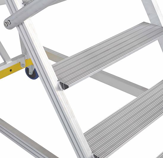 Вышка - стремянка разборная на колесах (300кг+150кг) MEGAL ВС3-3.5 предназначена для работ в торговых залах, на складах, вдоль стеллажей и других объектов, при проведении ремонтных, монтажных и иных работ на высоте. Представляет собой безопасную и легкую конструкцию из алюминиевых профилей высокой прочности. Имеет безопасные противоскользящие ступени из специального рифленого профиля. Площадка размером 800х680мм позволяет удобно расположиться рабочему с необходимым инструментом. Трехстороннее ограждение площадки со встроенной защитной планкой в районе колен, бортовое ограждение, перила по всей длине лестничного марша, ступени глубиной 160мм обеспечивают безопасный подъем, спуск и проведение работ, что подтверждает полное соответствие требованиям по ГОСТ. Все соединительные узлы и элементы полностью безопасны, обработаны и одобрены службой контроля качества. Простая и быстрая сборка лестницы без специального инструмента и поставка в виде предварительно собранных узлов сокращают время подготовки оборудования MEGAL к работе. Максимальный срок службы достигнут благодаря коррозионностойким свойствам алюминиевых сплавов. Небольшая занимаемая площадь и прочные поворотные колеса со стопорами позволяют легко маневрировать в ограниченном пространстве.
